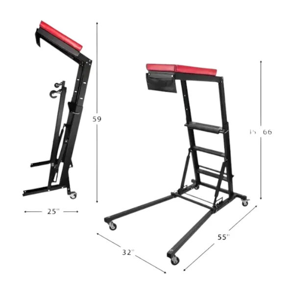 - Deck is padded and covered with heavy vinyl for comfort and durability Adjustable height for ease of use. 45″ to 66″ of engine compartment access